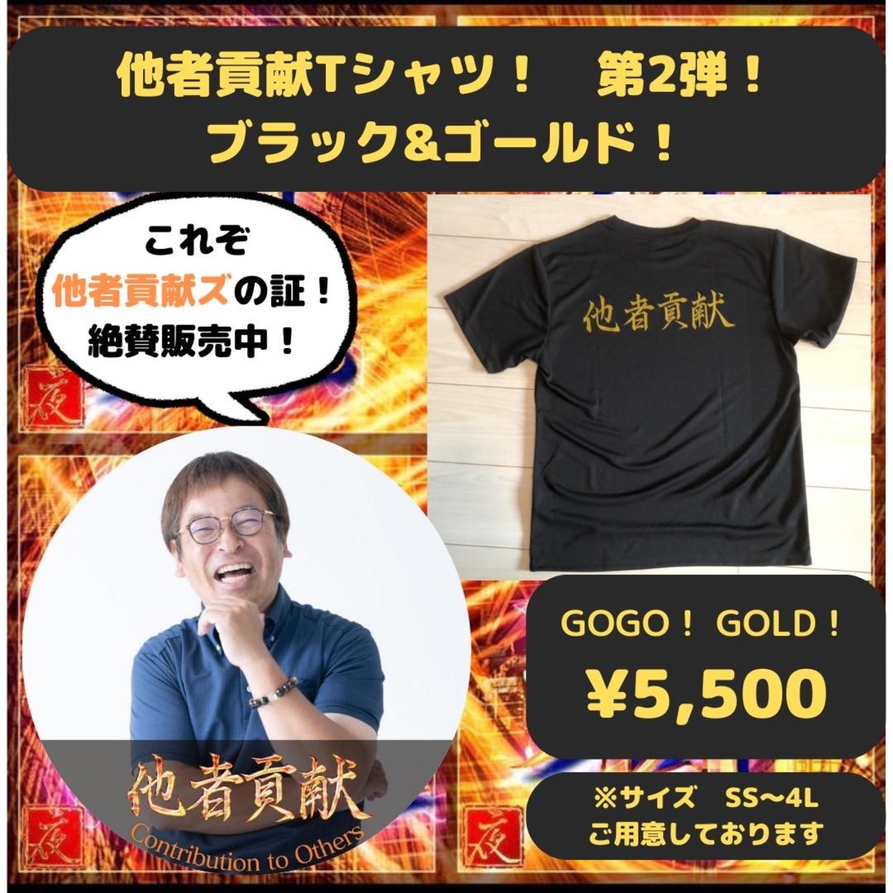 カッコよさ満点の他者貢献Tシャツ、ブラック&ゴールド(黒金)!オレンジ他者貢献Tシャツがちょっと恥ずかしいなぁと思われる方々はこれ着られてドヤりましょ!インテリアにも良し!